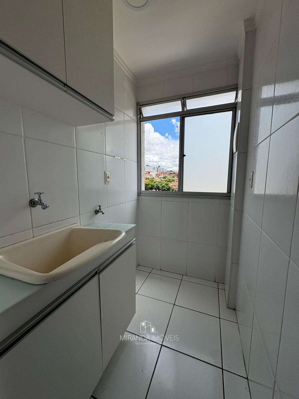 Cozinha fechada com armários e área de serviço. Banho social.