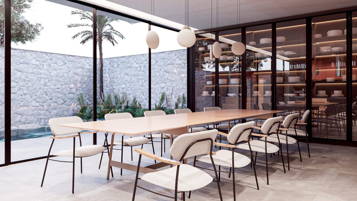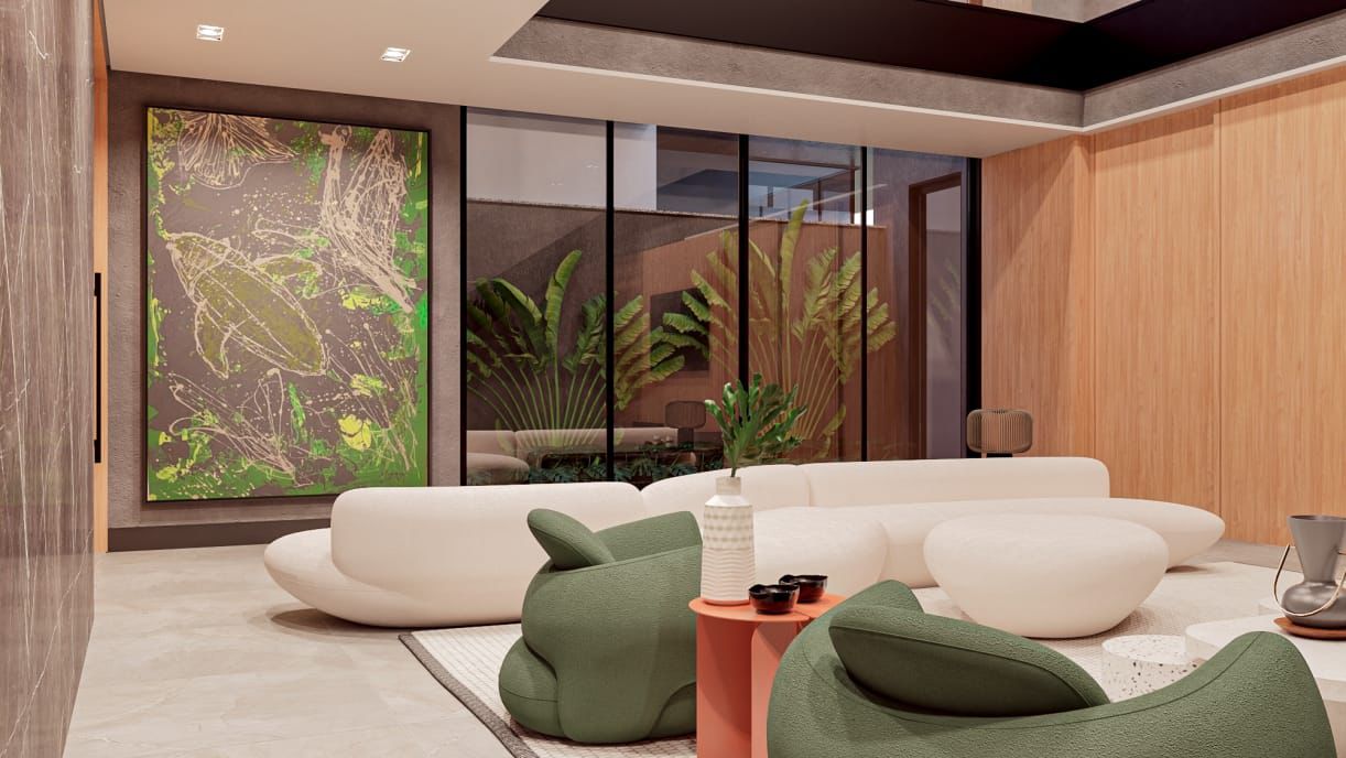 Primeiro pavimento em conceito aberto, pé direto duplo.
