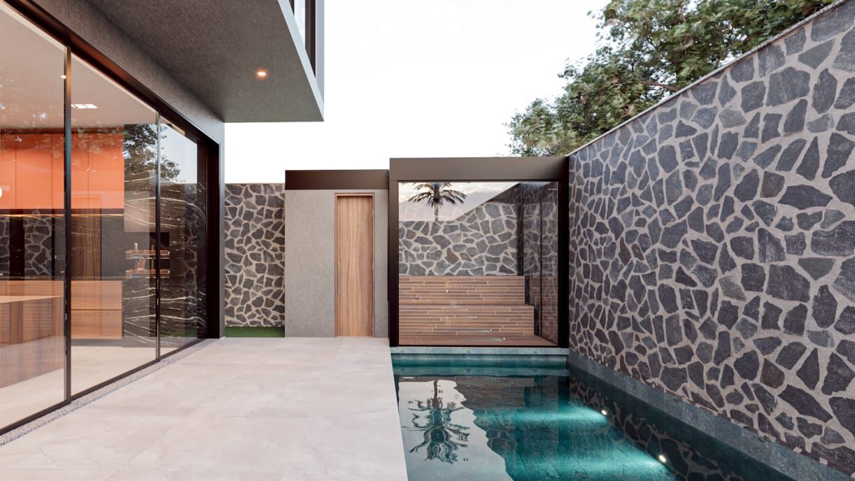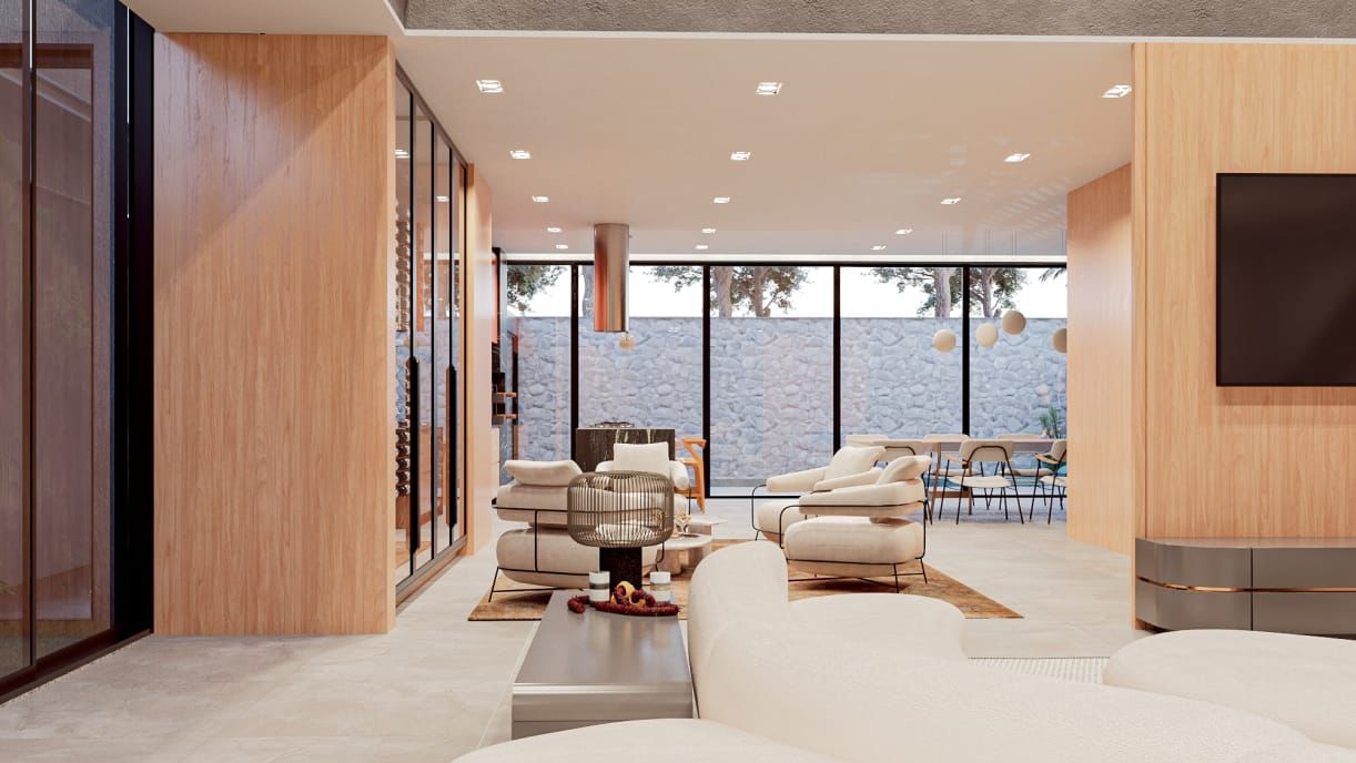 Sala para 03 ambientes, integrada a cozinha com ilha, adega, espaço gourmet com piscina aquecida e sauna.